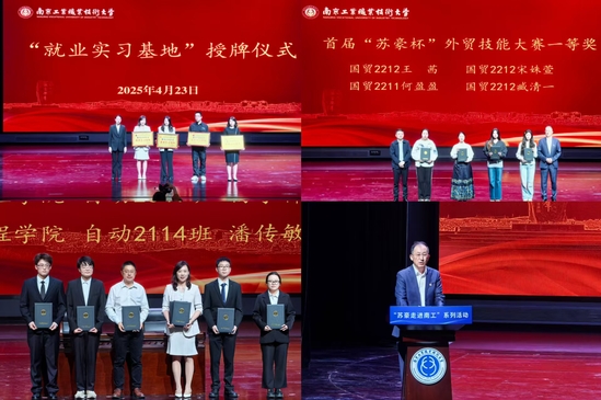 徐雨祥与高宏彦共同为数字贸易校企混编团队揭牌。该团队由苏豪集团5位企业导师及商务贸易学院5位教师联合组成,未来将聚焦跨境电商、数字营销等领域培养复合型贸易人才。徐雨祥与高宏彦共同为“苏豪-南工”高端纺织人工智能产学研基地揭牌,该基地的建立将聚焦人工智能与纺织业融合,推动技术创新与产业升级。徐雨祥和高宏彦等校企相关负责人为前期在首届“苏豪杯”外贸技能大赛获奖的20位同学颁奖。