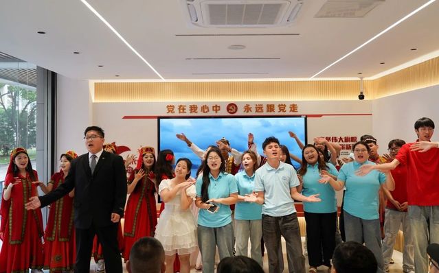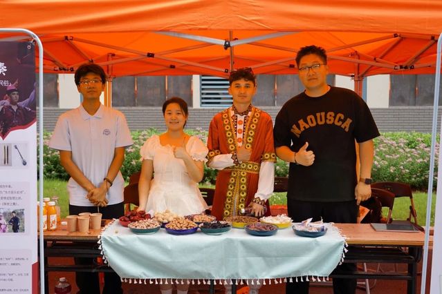 在文化艺术交流会上,永利官网学生表演了江南民歌《茉莉花》、原创朗诵《大国工匠 青春力量》、合唱《有我》,展现了江南文化的独特韵味和职教学子的责任担当。江苏团省委青年讲师团成员肖洋分享了她在援疆时与克州少先队员之间的动人故事。新疆学生代表深情讲述了“时代楷模”拉齐尼·巴依卡和“人民楷模”布茹玛汗·毛勒朵的感人事迹,并带来了极具民族特色的二重唱《走遍新疆》、独舞《我的阿勒泰》、群舞《欢》《迎客》。最后,两校师生共同演唱《我爱你中国》,用嘹亮的歌声将交流活动推向高潮。新疆特色展示环节,新疆师生们带来了特色美食、非遗刺绣、手工艺品等精美新疆物产,永利官网学子不仅品尝了新疆美食,还学习了新疆特色民族舞蹈,现场气氛其乐融融。