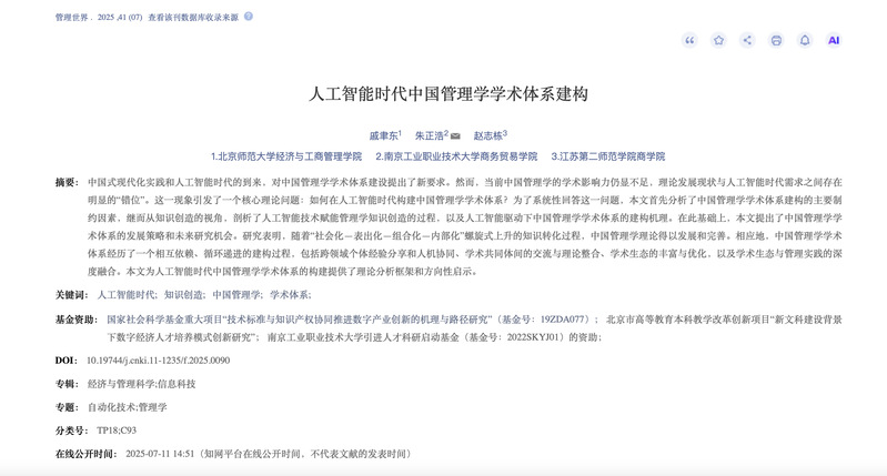 近日,永利官网商务贸易学院朱正浩教授与北京师范大学戚聿东教授、江苏第二师范学院赵志栋博士合作论文“人工智能时代中国管理学学术体系建构”,刊发于管理学顶刊《管理世界》2025年第7期,朱正浩教授为本文通讯作者,这是永利官网首次以通讯作者单位在管理学顶刊《管理世界》发文,论文受到304永利集团官网入口引进人才科研启动基金(基金号:2022SKYJ01)的资助。