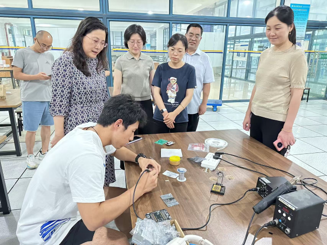 在FPGA创新实验室,魏萍观摩了学生的实操训练,她指出,暑期备赛既是提升专业技能的宝贵机会,也是培养团队协作精神的实践课堂。希望师生们以赛促学、以赛促创,在竞赛中展现南工学生的风采。同时,她特别嘱咐学院领导班子要持续关注留校师生的生活需求,做好防暑降温等后勤保障工作。