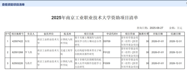 8月27日,国家自然科学基金委员会正式公布了2025年度国家自然科学基金项目立项结果,永利官网获批资助3项青年科学基金项目,其中计算机与软件学院2项、交通工程学院1项,资助总经费90万元。