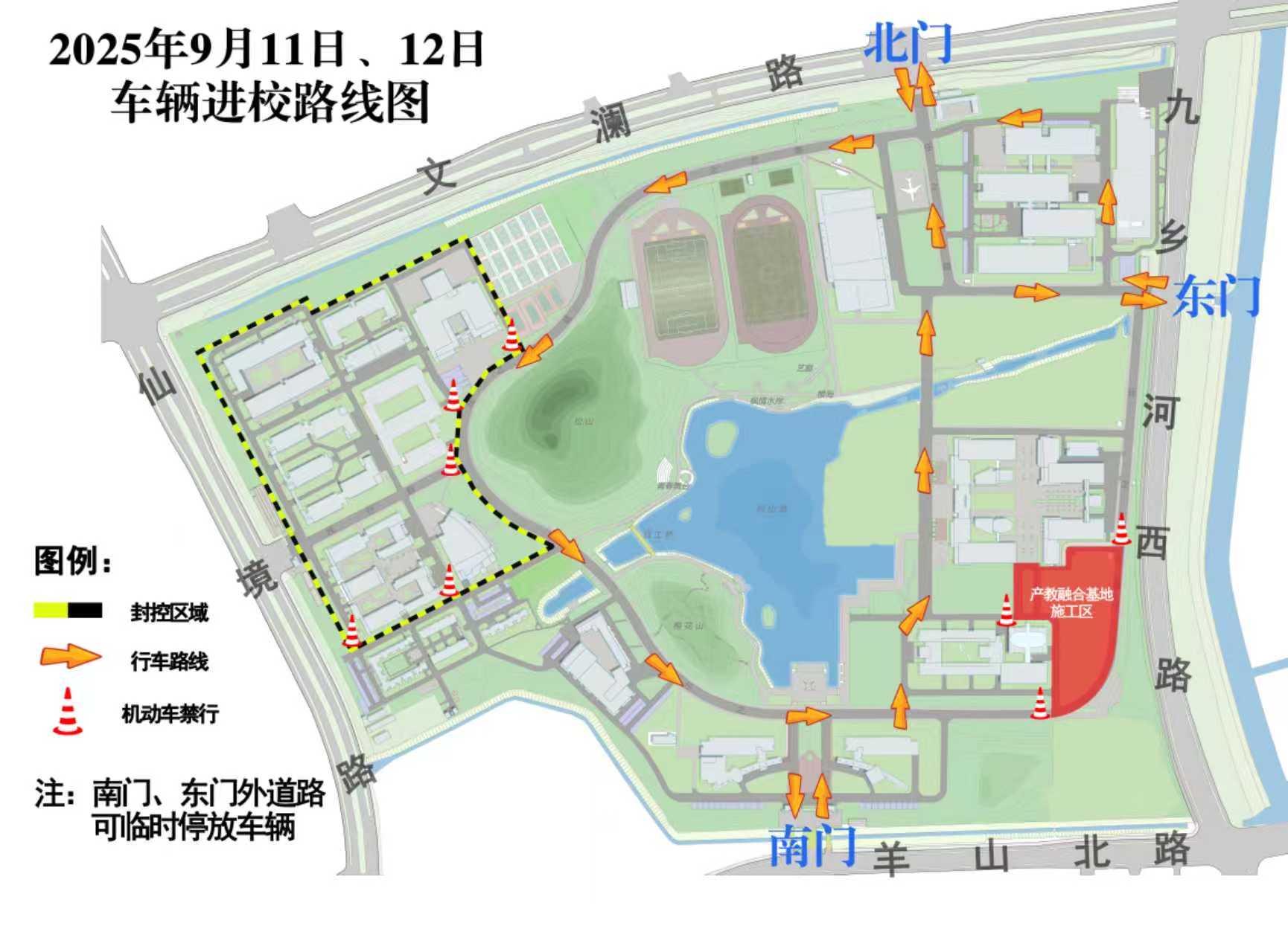 四、送新生进校的家长车辆可从北门、东门进入校园。进入校园时,请主动出示录取通知书或其他有效证明。按照逆时针方向沿大环路行驶,入校停车时间请控制在2小时内,可从南门、东门、北门驶离校园。请在车辆前车窗上预留联系方式,以便紧急情况下联系。