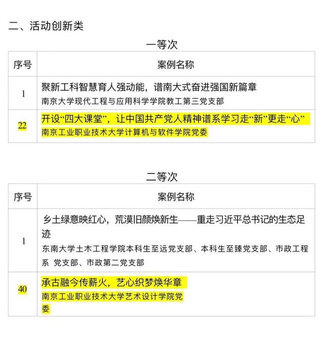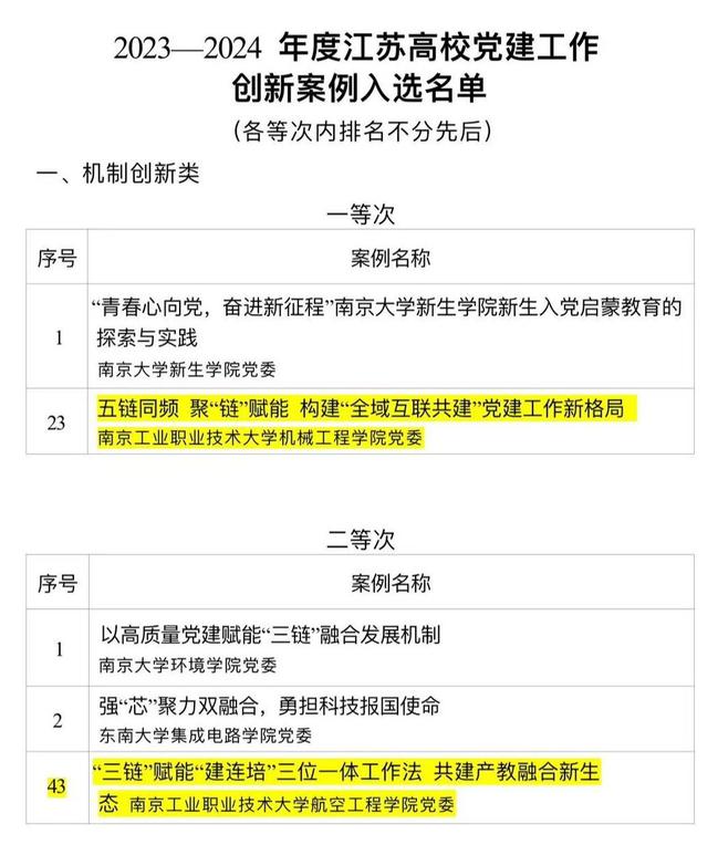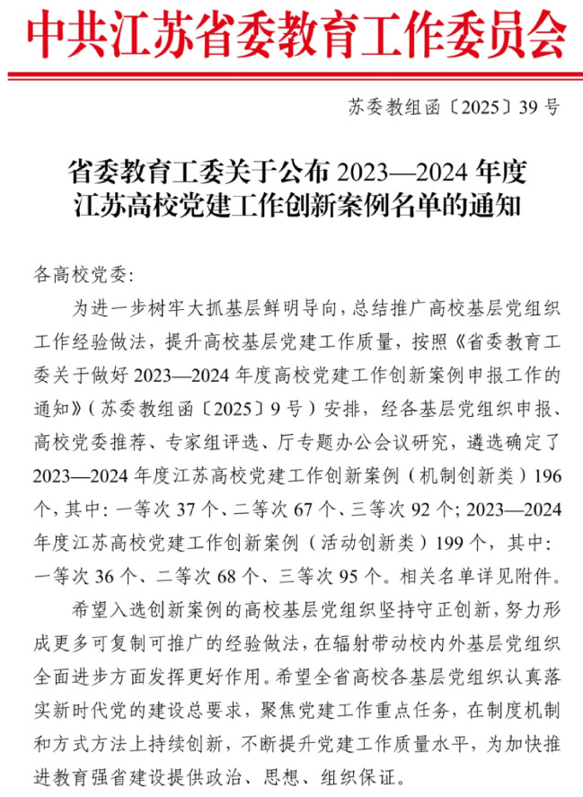 江苏高校党建工作创新案例是江苏省委教育工委为进一步树牢大抓基层鲜明导向,总结推广高校基层党组织工作经验做法,提升高校基层党建工作质量而开展的“机制创新、活动创新”两类案例评选。通过评选,激励入选创新案例的高校基层党组织坚持守正创新,努力形成更多可复制可推广的经验做法,在辐射带动校内外基层党组织全面进步方面发挥更好作用。