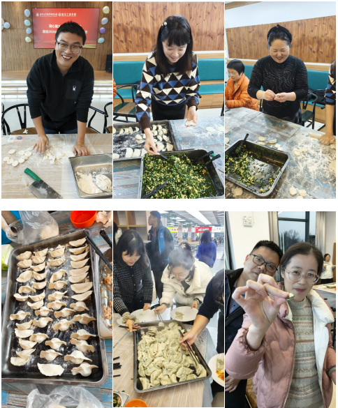 下午三点,活动正式拉开帷幕。教职工们根据包饺子的熟练程度自发组成多个小组,迅速投入到热火朝天的“生产”中。和面、擀皮、调馅、包捏......各个环节井然有序。经验丰富的老师手法娴熟,包出的饺子形如元宝;初学者则在“高手”指导下认真模仿,虽然形状各异却创意十足。整个过程中,大家互相交流技巧,分享心得,平日里严谨的学术氛围被温馨的烟火气所取代。
