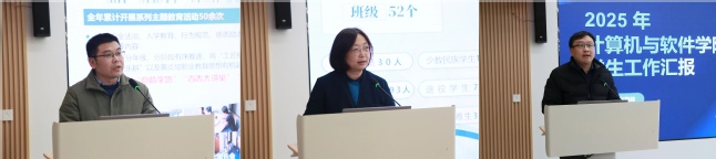 交流环节,各学院依次登台,围绕2025 年度学生工作进行总结交流。各学院紧扣立德树人根本任务,立足学院专业特色与学生特点,以详实的数据、鲜活的案例和创新的思路,全面展示了过去一年在思想引领、学生培养、服务保障等方面的扎实举措与显著成效。在日常工作中,各学院始终秉持夯实基础、筑牢防线的理念,通过强化日常教育引导工作、深化内涵式学风建设、丰富校园文体活动形式、常态化推进心理健康教育以及稳步落实招生就业工作等举措,为学生的全面发展与健康成长筑牢坚实支撑。在特色工作领域,各学院紧密结合学科优势,精心打造育人品牌,借助党建引领、深耕实践育人路径、聚焦双创赋能发展、创新文化育人模式等具体行动,充分彰显育人特色。