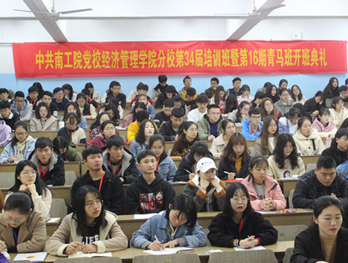 根据经济管理学院党总支总体部署,3月13日下午,中共南工院党校经济管理学院分校第34届培训班暨第16期青马班开班典礼在乐业楼阶梯教室J5101隆重举行。党总支书记陈林杰、教工支部书记、兼职组织员、学生支部书记、全体辅导员以及190名学员参加了本次开班典礼。
