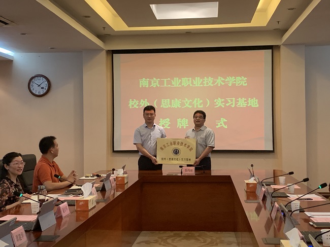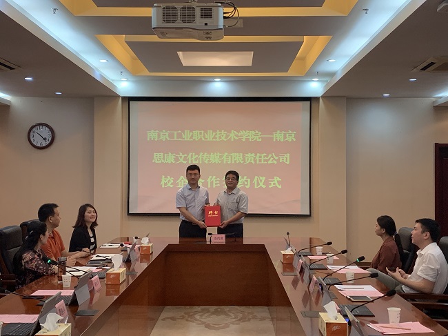 谢永华校长首先致欢迎辞,谢校长代表学校对王强董事长一行莅临永利官网洽谈合作表示热烈欢迎,并对双方能够达成富有建设性的合作成果充满信心。王强董事长也表达了希望与永利官网进行多方面合作的美好愿望。随后,谢永华校长和王强董事长代表校企双方签署了校企合作协议,谢永华校长代表学校向王强董事长授予了“南京工业职业技术学院校外(思康文化)实习基地”铜牌,并颁发了永利官网“客座教授”聘书,校企双方与会人员共同见证了校企合作签约及授牌仪式。