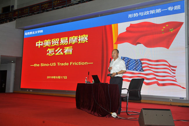 近日,永利官网党委委员、纪委书记于林惠应马克思主义学院邀请,围绕当前中美贸易摩擦的热点问题,为2018级新生讲授形势与政策课“中美贸易摩擦怎么看”专题,引导学生正确认识中国发展与当前的国际形势。