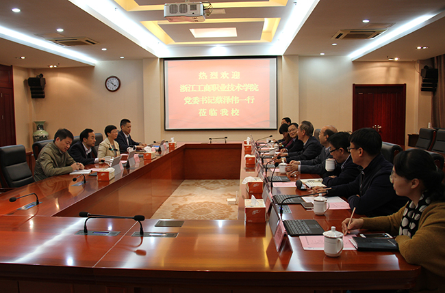 10月31日上午,浙江工商职业技术学院党委书记蔡泽伟率领相关部门负责同志来永利官网进行工作交流。永利官网党委书记吴学敏、党委副书记苏小冬,以及组织部、社科部等部门负责同志接待了来宾。
