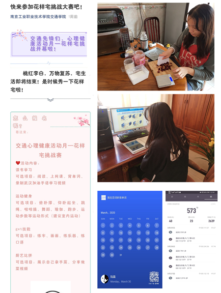 随着新型冠状病毒感染的肺炎疫情持续发展,交通工程学院密切关注学生居家学习生活带来的心理成长问题,进一步落实学校“逆境携行,你我同心”心理健康主题教育,引导学生在疫情防控期间正确认识挫折,及时调整负面情绪,提高心理免疫力,增加心理韧性等。学院积极利用微博、微信等新媒体平台发布疫情防护知识,开展促进相互关爱支持、倡导身心健康生活的“花样宅挑战赛”,为全面打赢疫情防控阻击战提供坚实的心理保障。