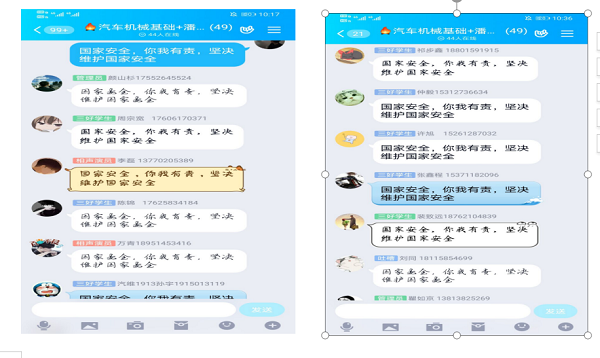 汽装1911班和汽维1913班同学发起了“国家安全,你我有责,坚决维护国家安全”接龙活动。班级学生干部率先承诺:国家安全,你我有责,坚决维护国家安全。引领班级学生践行承诺,杜绝一切危害国家安全的行为,争做维护国家安全的中坚力量。