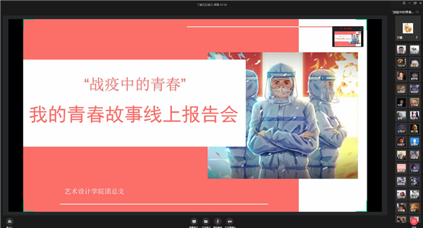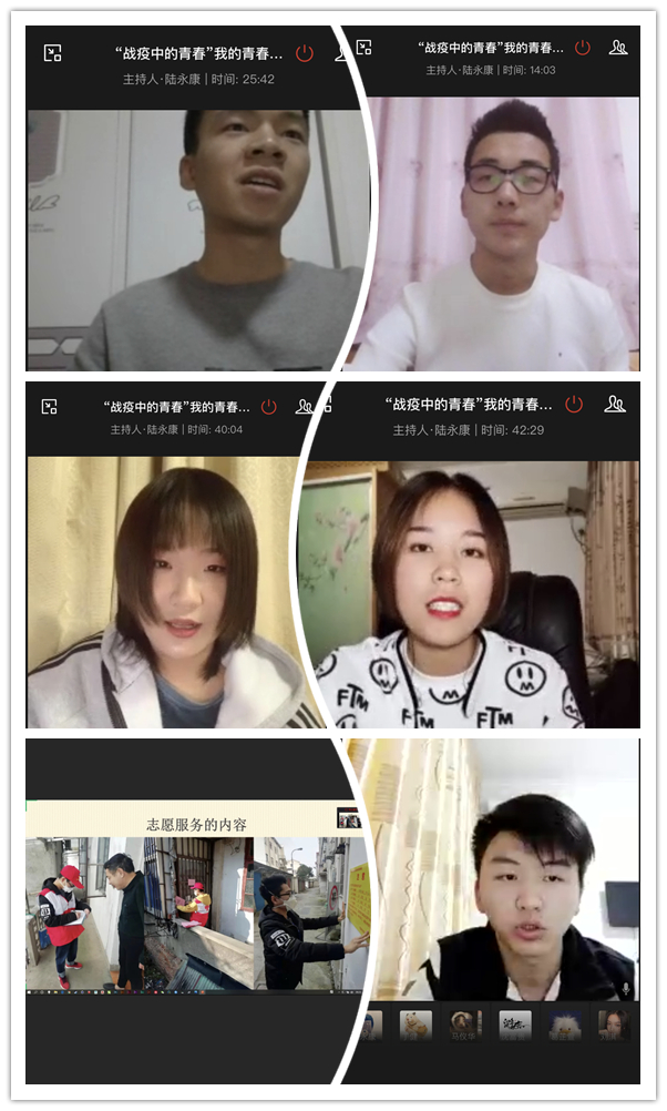 艺术设计院团总支副书记、视觉1811班丁健同学介绍了院团总支在疫情期间的工作开展情况及成效,讲述了自己在南京市高淳区甘霖路社区进行防疫志愿工作时的点点滴滴;环艺1811班的董自新同学利用自己的专业特长向村中的留守老人和儿童宣讲防疫知识;环艺1813班的陈龙同学在工作人员上门进行居民情况登记时主动要求加入志愿者行列,对社区进出人员和往来车辆进行登记,为志愿者们分发口罩;环艺1921班的彭苏畅同学和视觉1711的徐敏同学同为退伍军人,他们在疫情爆发后积极响应地方政府号召,秉持着全心全意为人民服务的精神,加入到防疫志愿者行列;环艺1913的刘淇同学讲述了与她一起值班的志愿者哥哥的故事,新婚不久的他,毅然决然地加入到了防疫工作中,平凡人书写了不平凡的故事。