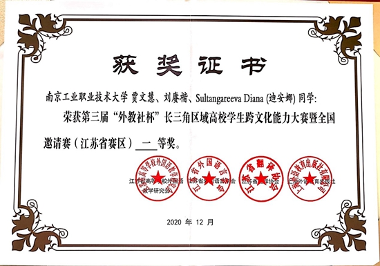 12月8日,第三届“外教社杯”长三角区域高校学生跨文化能力大赛比赛省赛评审工作在东南大学九龙湖校区举行,公共基础课部和国际教育学院选派了刘赓楷(2019级机械制造与自动化专业)、贾文慧(2020级国际贸易专业)和Sultangareeva Diana迪安娜(留(2019秋)国际贸易专业)等三名选手组成比赛团队,近日大赛结果公布并颁发证书,永利官网学生团队喜获大赛一等奖。公共基础课部大学英语教研室张卉和国际教育学院孙世娟两位老师荣获“优秀指导教师”称号。