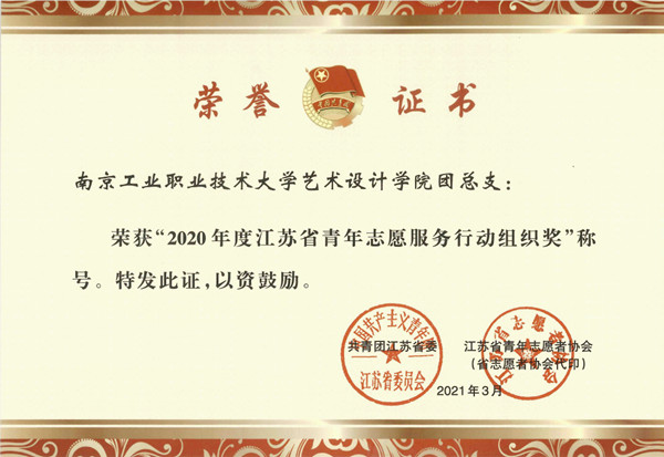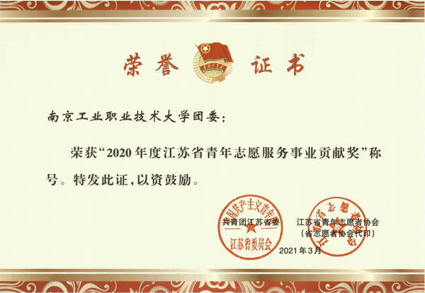 校团委荣获“2020年度江苏省青年志愿服务事业贡献奖”,艺术设计学院团总支荣获“2020年度江苏省青年志愿服务行动组织奖”,航空工程学院电信2036班王志远同学获评“2020年度江苏省优秀青年志愿者”。