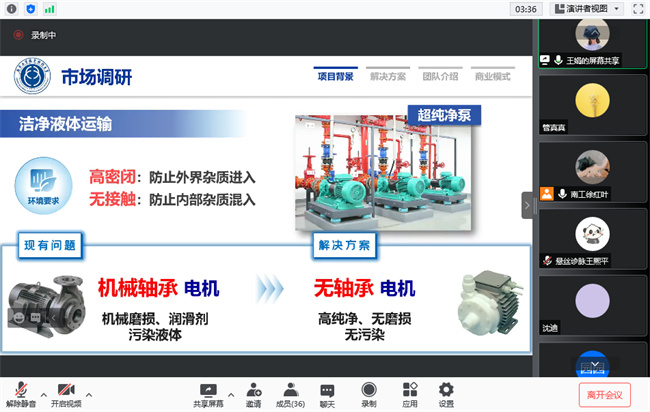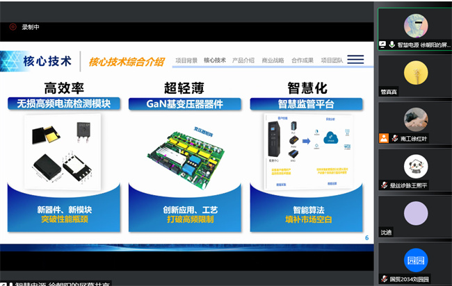 经过前期征集遴选,在各二级学院和科技园公司的推荐下,“基于磁悬浮技术的纯净泵系统”、“GaN基高性能超轻薄智慧电源”、“雷达式生命体征监测仪”、“智风——高性能风机散热设备先行者”、“纳米隔音建材”、“基于DLP光源的陶瓷成型打印机”、“思客演示”等7个双创项目入选本次“云路演”活动。各项目负责人分别就项目概况、核心技术、市场分析、发展规划等方面进行了“云路演”展示。创业导师团从行业需求、竞争对手分析、知识产权等方面对路演项目进行了精彩点评和指导,对项目质量、项目成效、项目前景给予了充分肯定,将在平台对接、资源整合、投融资等方面持续跟进支持项目发展,同时也提出了针对性改进建议。