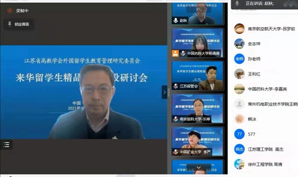 11月28日,由江苏省教育厅指导,江苏省高教学会外国留学生教育管理研究委员会主办,中国药科大学承办的江苏省来华留学生精品课程建设研讨会在线上举行。本次论坛主题为“留学生精品课程的建设”,分享留学生精品课程建设的经验和存在的问题,探讨在后疫情时代如何发挥精品课程的引领作用。中国药科大学副校长孔令义,江苏省教育厅对外合作与交流处副处长施蕴玉,江苏省高等教育学会外国留学生教育管理研究委员会张海军、俞晓南为大会致辞和会议总结。