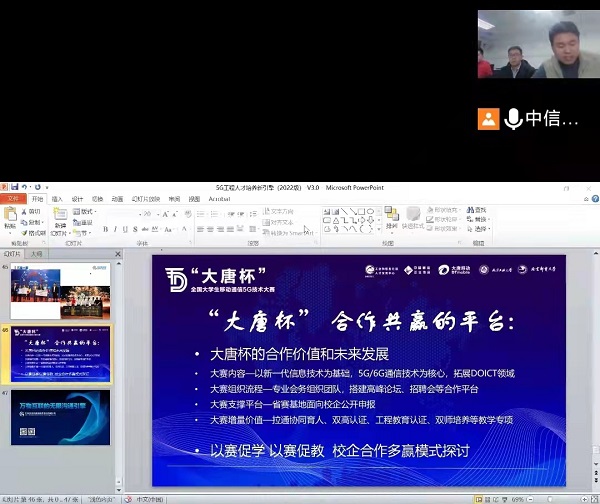 会议由袁兴和李坡主持。袁兴首先介绍了中信科移动及教学业务,详细介绍了中信科的“5G工程实践培养方案”,“5G仿真教学培养方案”、“5G+创新应用及科研课题方案”及“大唐杯”赛事情况。张庆海重点介绍了现代通信工程专业的师资队伍、校企合作等专业情况。其后,李坡老师表达了通信工程专业目前在5G+课程实施、5G科研与教学实验室、教师技术技能提升、大唐杯赛事等方面的需求。