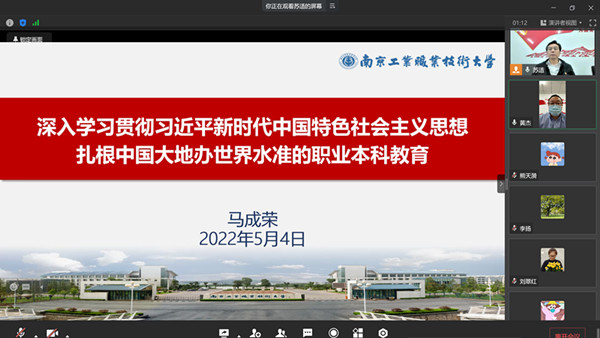 5月4日下午,校党委副书记马成荣以《深入学习贯彻习近平新时代中国特色社会主义思想 扎根中国大地办世界水准的职业本科教育》为题为航空工程学院全体教职工作专题报告。本次报告采取企业微信线上线下相结合的方式同步进行,校内教职工线下参会,其他教职工线上参会,会议由航空工程学院党总支副书记、院长黄杰主持。