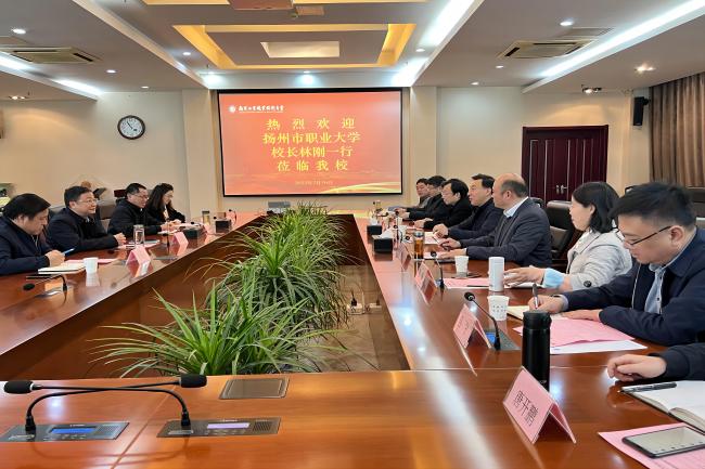 3月16日上午,扬州市职业大学校长林刚一行来永利官网考察调研。党委常委、副校长朱建国以及相关部门负责同志在仙林校区行政楼辅楼一楼会议室接待了来宾。