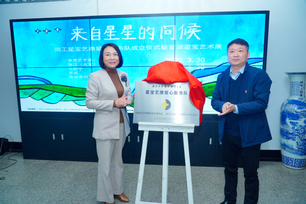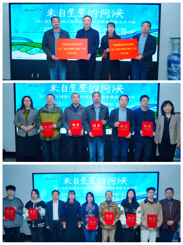 成立仪式上,民盟南京市委副主委邵蔚与学校党委常委,组织部、统战部部长高宏彦共同为“南工星宝艺康爱心服务队”成立揭牌。民盟各级领导为爱心服务队师生颁发了聘书。南工星宝艺康爱心服务队得到了民盟南京市委、栖霞基层委的大力支持,民盟南工支部主委孙静松代表支部接收32000余元资助基金。
