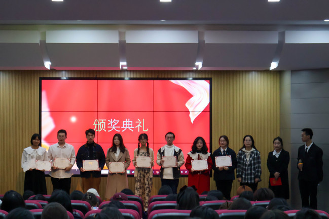 为提升校园文化氛围,提高艺术设计学院学生的综合素质,展示大学生的文化艺术素质和健康向上的精神风貌,给热爱播音与主持艺术的同学们提供展示自我的机会,11月26日,艺术设计学院举办了“话”茧成蝶 “音”韵而生——第三届主持人大赛。本次比赛共有37名同学参赛,经过初赛角逐,9名同学进入决赛。决赛由艺术设计学院广播站负责人冯瑞同学主持,团委副书记靳喆和学生代表担任评委,180余位同学艺术学子现场观赛。