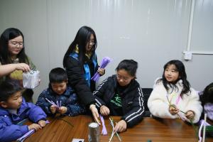 在江枫苑社区,传统技艺师傅向社区儿童介绍南京市非遗技艺“绒花”的发展历史与文化内涵,并现场教授基础的制作手法。孩子们了解到绒花谐音“荣华”,由天然蚕丝和铜丝作为原材料制作而成,多用于民俗节事与礼仪装饰之中,用以表达吉祥如意之意趣。在志愿者的帮助下,社区儿童和家长们制作出一朵朵温馨可爱的小小绒花。